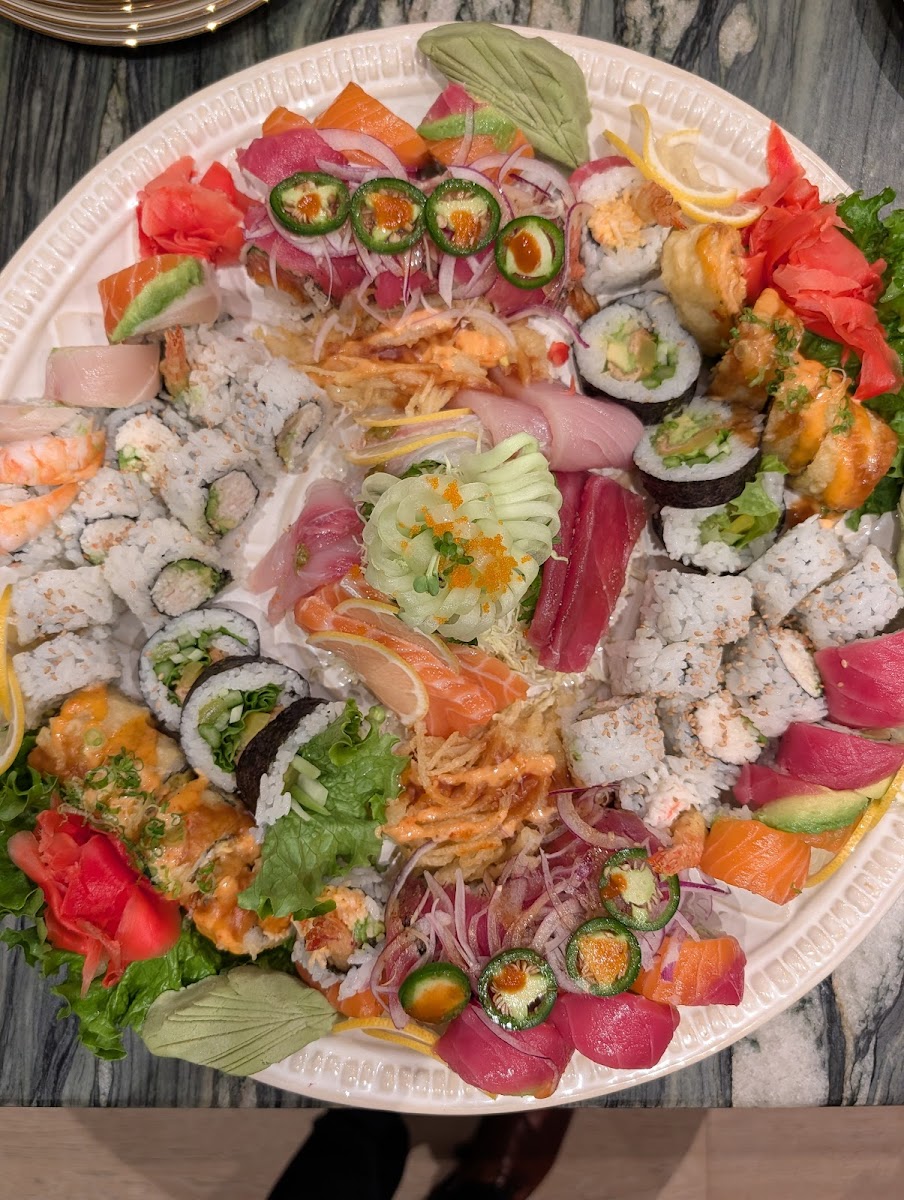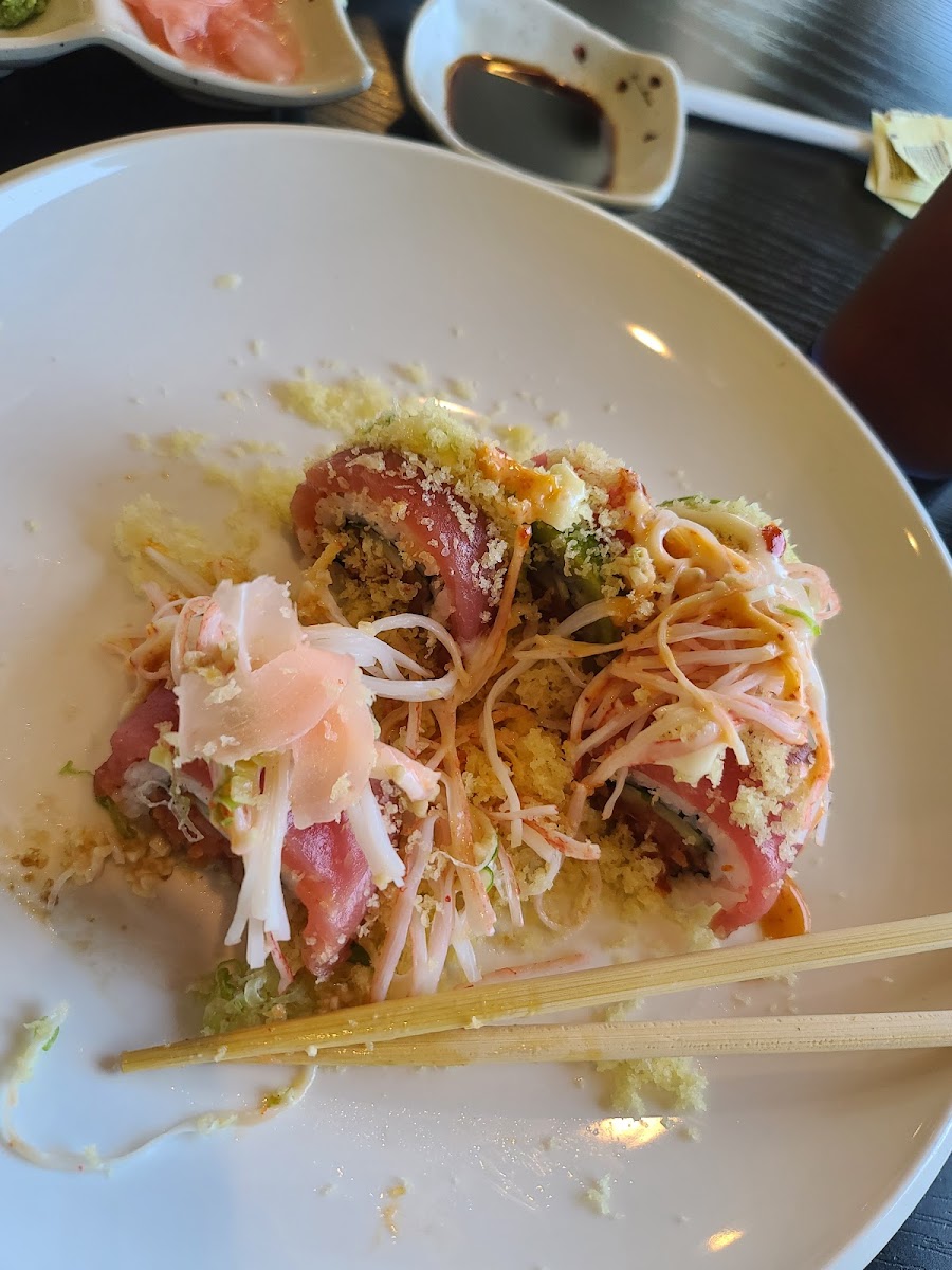 Ordered the Syracuse house special roll as recommended by the waitress. It was served with a side of wasabi and some very vibrant pink picked ginger. Although the roll didn't look like a roll, it was still flavorful and delicious! I ordered it with my usual nigori cold unfiltered sake, which although the only brand they had on hand at the time was a bit on the sweet side, was still enjoyable. I also finished up with a last minute order of my favorite mackerel sushi, although I forgot to take a pic of the two pieces before devouring it. Theirs was definitely better than average as it was flavored with a slight smoky grilled flavor which was unique and made it taste very high end. I'll definitely be coming back on my next trip to Fallbrook! Also the bathrooms were clean and scented well!