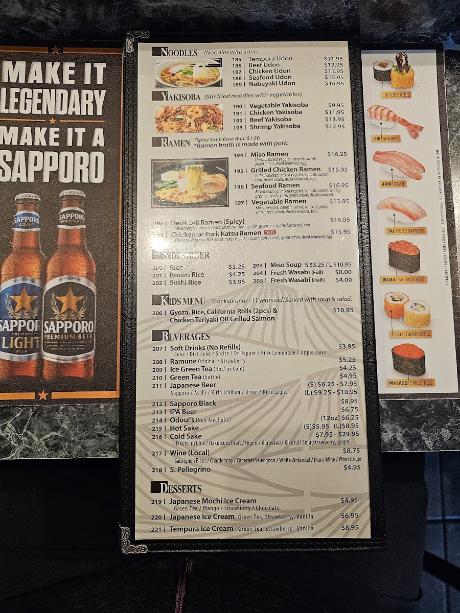 Guests can enjoy comforting soups like miso or richly flavored options such as seafood ramen, alongside fresh combinations like the Dragon Roll or the Spicy Tuna Roll. Lighter bites, including softshell crab appetizers and assorted sashimi, provide an easy way to sample delicate textures and clean tastes. For those wanting a satisfying yet familiar meal, options like chicken and beef yakisoba or chicken katsu fit seamlessly into the well-paced, friendly atmosphere.